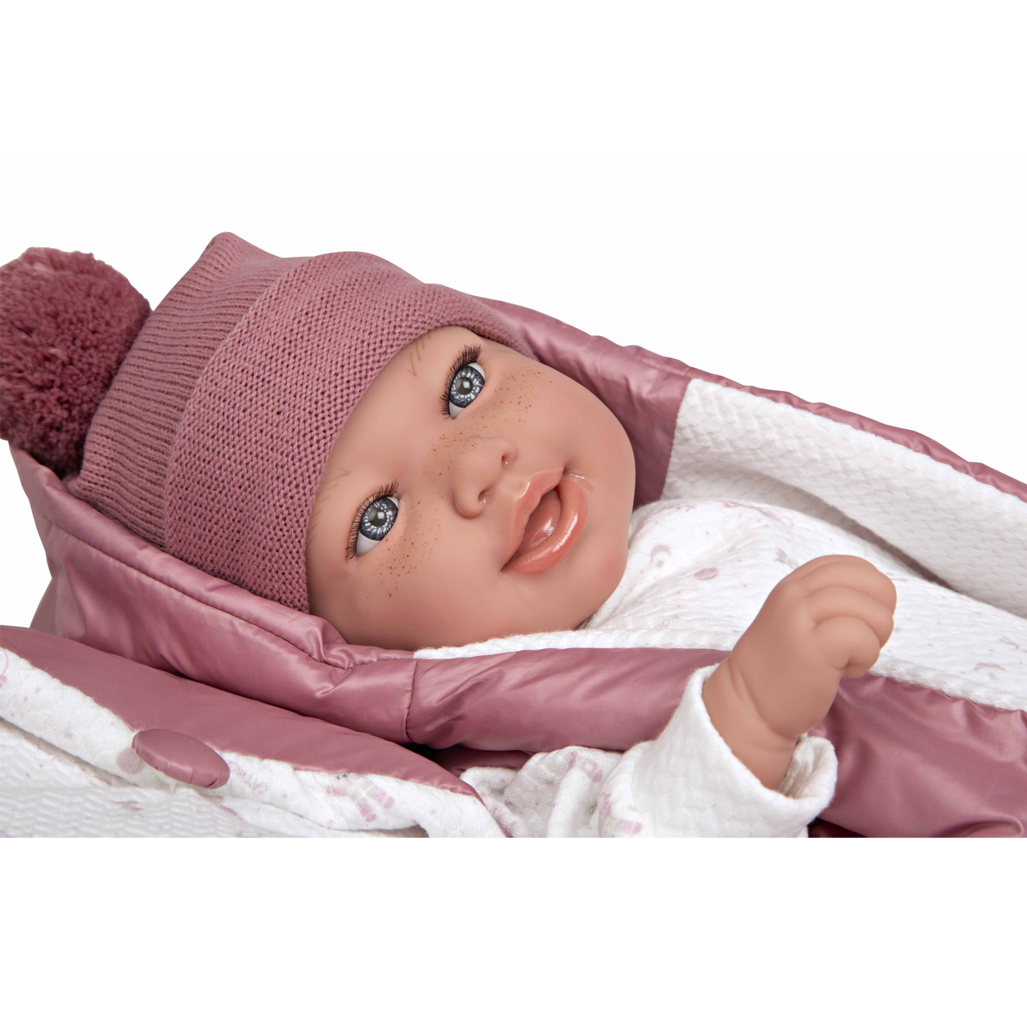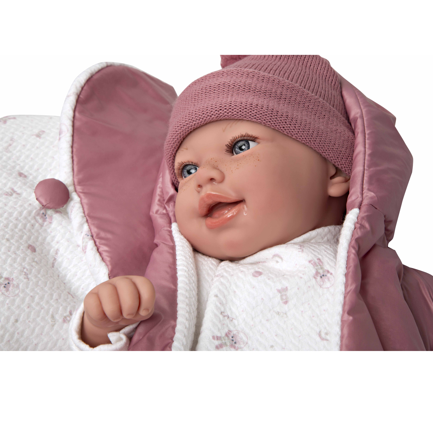ELEGANCE 45 cm Adi doll dressed in pajamas and vest in light tones, pink and makeup. Its weight is so real that it looks like a real baby. Includes backpack and pacifier.