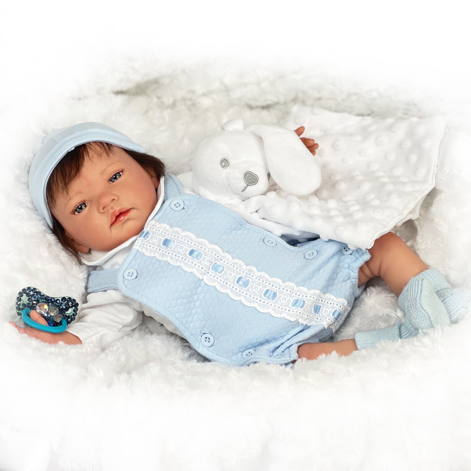 Fred is a very special baby designed and created with love by Alfie age 6, this fine reborn baby is like a work of art. Handmade too with love, the dolls look just like real babies. He is a truly stunning baby, with beautiful awake blue eyes, a sweet expression and sweet lips that can also take a magnetic dummy. He is hand painted for the perfect skin tone, hand rooted hair and with amazing detail and perfect fingernails. A weighted soft body. We know that the arrival of your baby is a very special event.