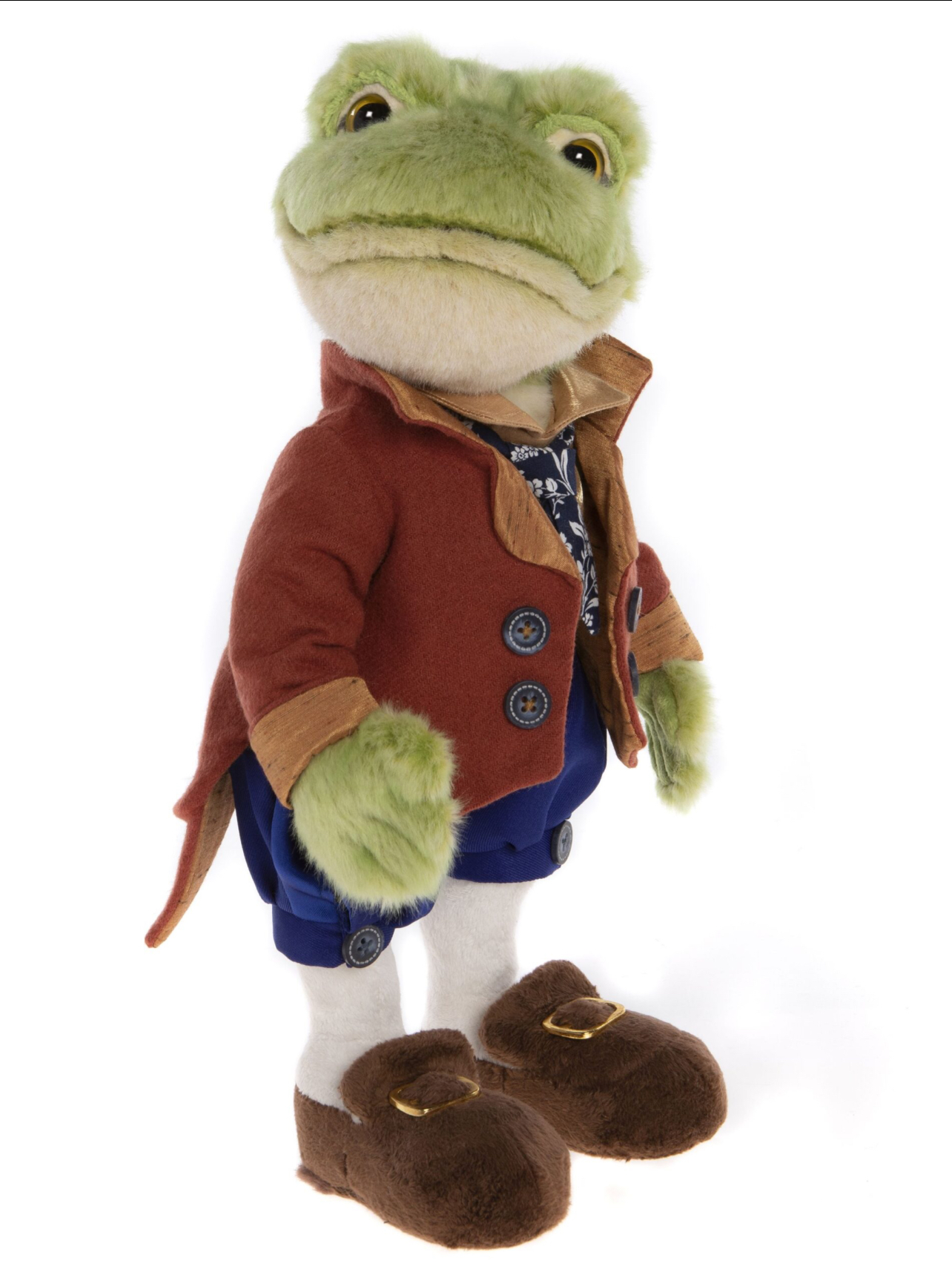 Frog Footman 38cm is a fully jointed, dressed character with distinctive bulging eyes and wide lipped expression. He has been sewn from a luxurious soft, apple green plush, with off white accents, defined digit ‘hands’, plus smooth flat soles for independent free-standing and ease of display. He has engaging, glossy safety eyes with delicate, hand applied colour shading for detail, blending and personality, whilst being part-bean filled results in a good weight and snugly, cuddly feel. To finish, he wears a period tailored livery, of a long-tailed rust-brown coat with tan trim and buttons, detailed buckled cocoa shoes, long white stockings, short royal blue trousers and a co-ordinating waistcoat.