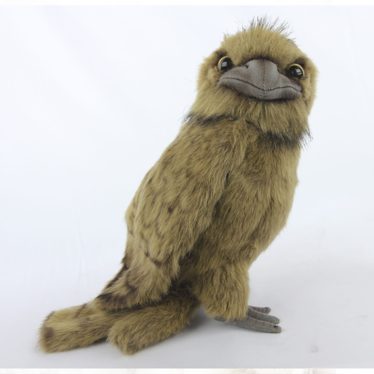 The Frogmouth is a plush soft toy. He has been sewn from a mix of luxurious plush, to resemble that of his living counterpart. This frogmouth has a genuine realistic form and has been crafted from a dense and semi-fluffy, tonal nutmeg short-pile, with contrasting velvety-smooth accents for his beak and his lower limbs, plus a black-tipped nutmeg long-pile for his beard and crest. He has glossy, two-tone golden safety eyes, with a turn able head, whilst hand applied painting has been used to define and shape his plumage, beak and lower limbs. All this and he is still wonderfully soft and cuddly, with a delightfully tactile touch.