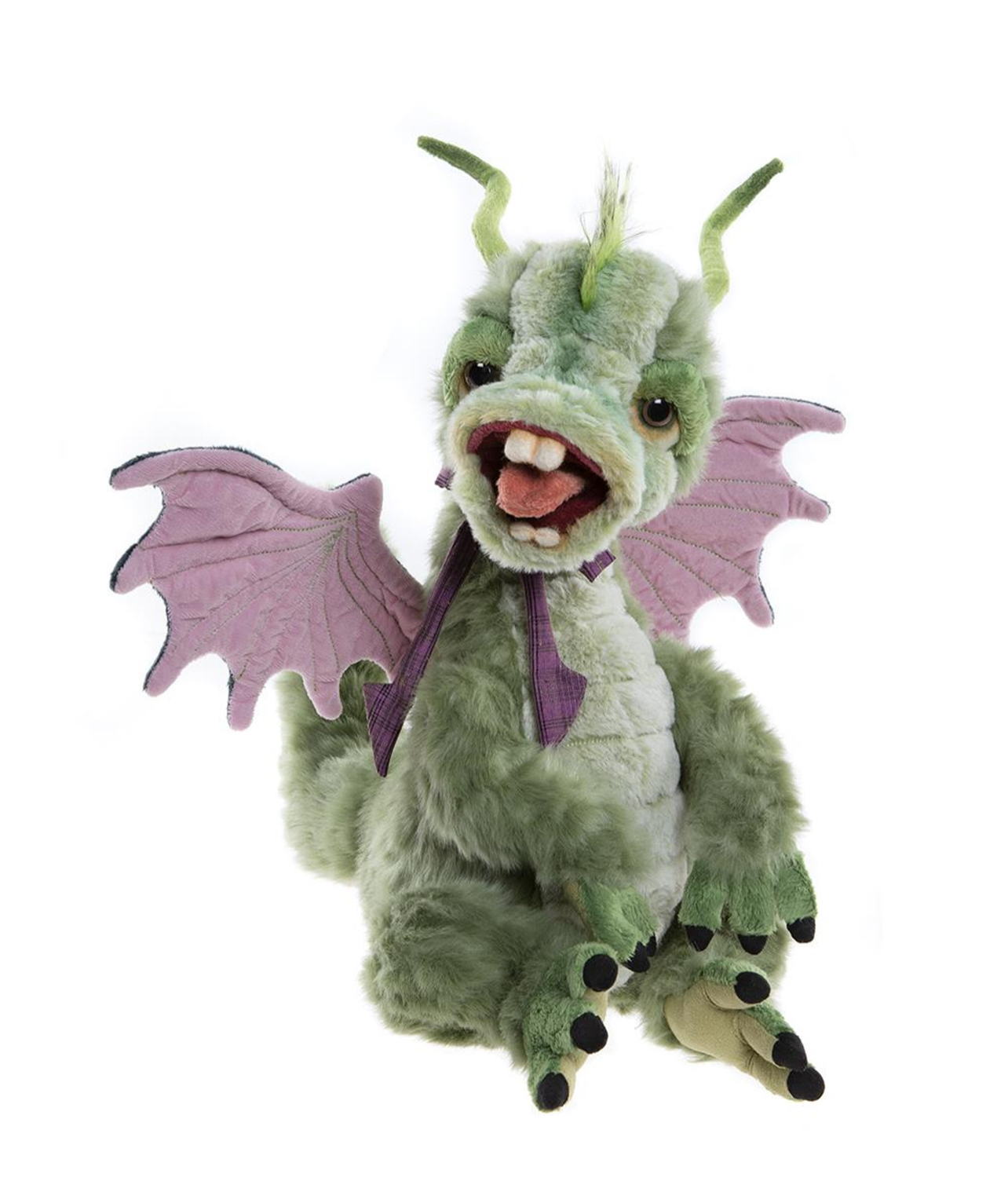 Jabberwocky from Charlie’s Signature Collection has been crafted from the finest plush fabrics in a rich palette of green hues, featuring velvety soft pink inner wings delicately detailed with green stitching. Equal parts mythical and magnificent, this whimsical creature captivates with a wide, toothy grin and expressive eyes that exude quirky charm. A subtle purple tartan bow adds the perfect finishing touch to his enchanting look, a heart-stealer from the moment you meet him. Limited edition of only 750 pieces globally. Recommended for ages 14 years +. Jabberwocky height: 46cm/18″/15 Bear Paws.